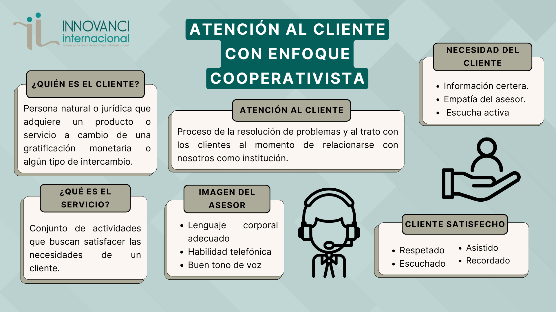 Conceptos generales sobre el modelo cooperativo, acerca de, que es una cooperativa, el cooperativismo y sus principios y valores, complementando con la estructura de una cooperativa. De forma consecuente, definiciones sobre que es un cliente, que tipos de clientes hay en una agencia, además de, que es un servicio desde diversos escenarios, diferencias y similitudes de servicio al cliente y atención al cliente, seguido por las funciones que tiene un asesor. Finalmente se manifiesta que es la experiencia del cliente, como se la construye y mantiene.